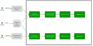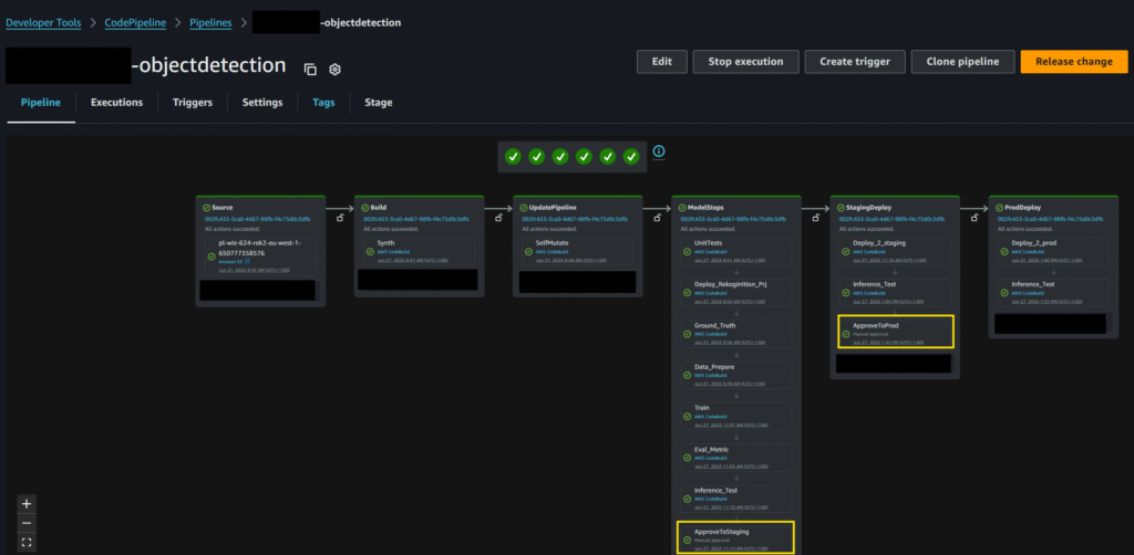 Both projects are built, trained, and deployed through a CI/CD pipeline, as shown below. The pipeline consists of multiple stages: