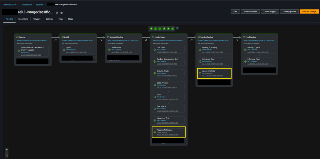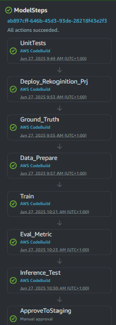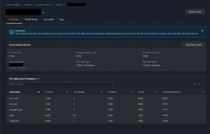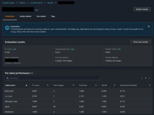 Once training is complete, the Rekognition Custom Labels service produces an evaluation report that summarizes model accuracy against the testing dataset. The CI/CD pipeline automatically retrieves these metrics and applies pre-defined thresholds to determine if the model is production-ready.