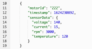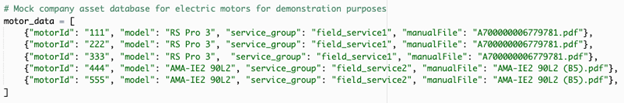 The sensor data includes only the motor ID, while the motor model and field service group ID are stored in the company’s asset database. The solution must query this database to retrieve the necessary information. Below is a sample of the aggregated sensor data in JSON format, followed by a sample asset database prepared for this problem.