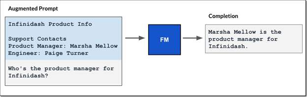 The retrieved text is added to the original prompt, creating an augmented prompt that is passed to the foundation model. The model leverages this extra context to generate a more accurate and relevant response, as illustrated in the figure below