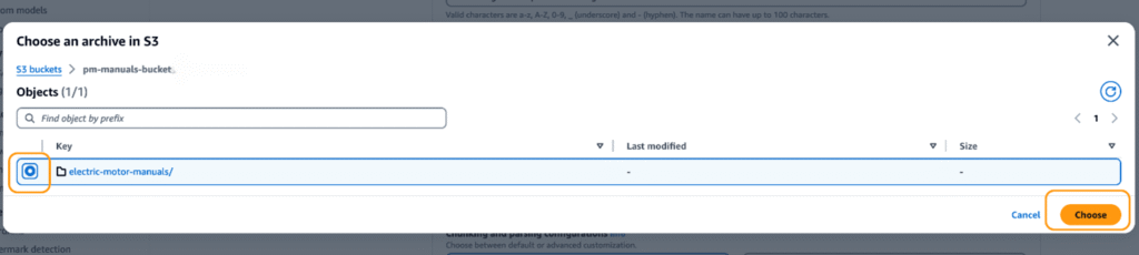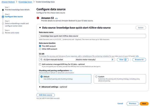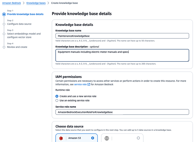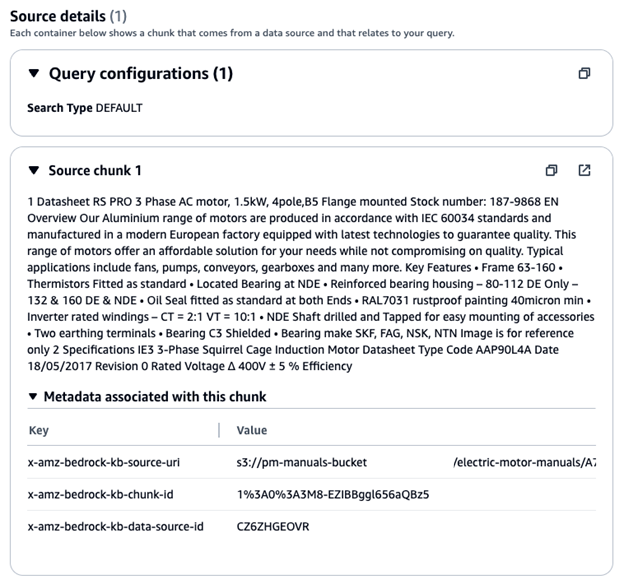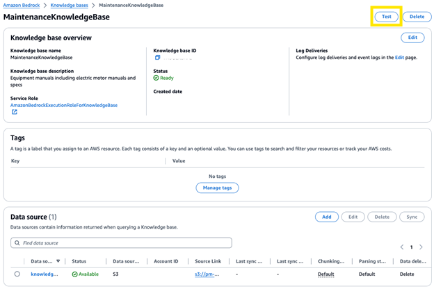You’ve now set up an Amazon Bedrock knowledge base using an S3 data source. With this knowledge base, LLMs can generate accurate, relevant responses to technical questions about electric motors, grounded in your company’s data. Next, let’s move on to building the predictive maintenance agent.