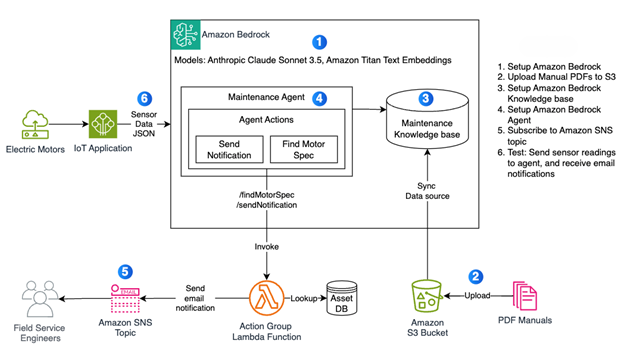 The company operates an IoT data pipeline that aggregates sensor readings from electric motors every five minutes. Your task is to build a Generative AI–powered anomaly detection solution that analyzes this data, compares it against manufacturer specifications, and alerts the appropriate field service team when anomalies are detected.