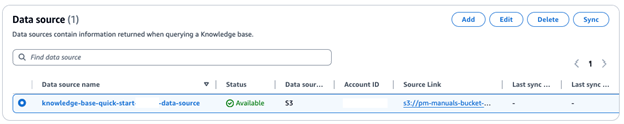 After creating the knowledge base, you need to sync the data source so the documents are ingested into the vector database and ready for queries. Go to the Data source(s) section, select your S3 data source, and click Sync.