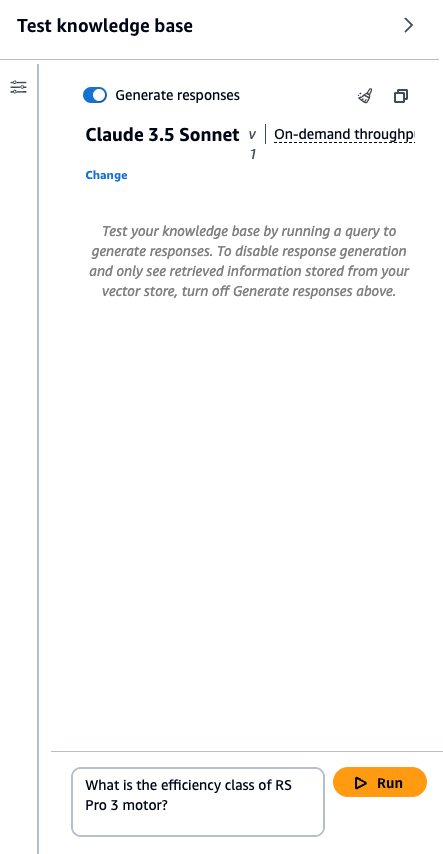 After the sync is complete, you can test your knowledge base using the test playground in the Amazon Bedrock console. Click Test to open the test panel.