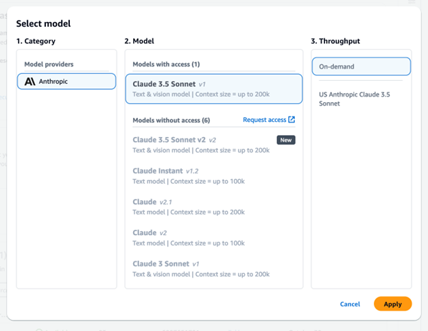 Select Claude 3.5 Sonnet with Throughput On-demand and click Apply.