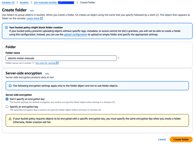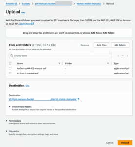 3. Name it electric-motor-manuals and leave the rest as default. Hit Create—and you’re ready to upload your PDFs!