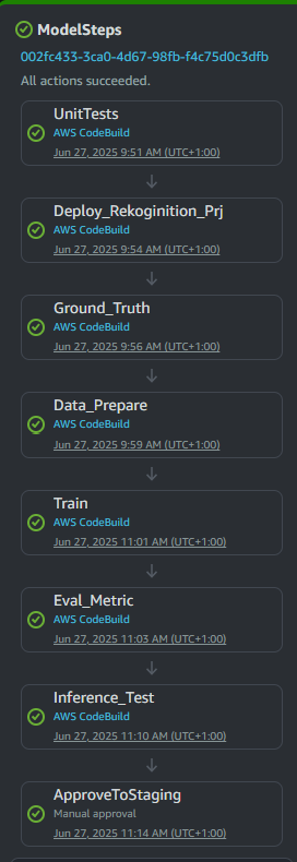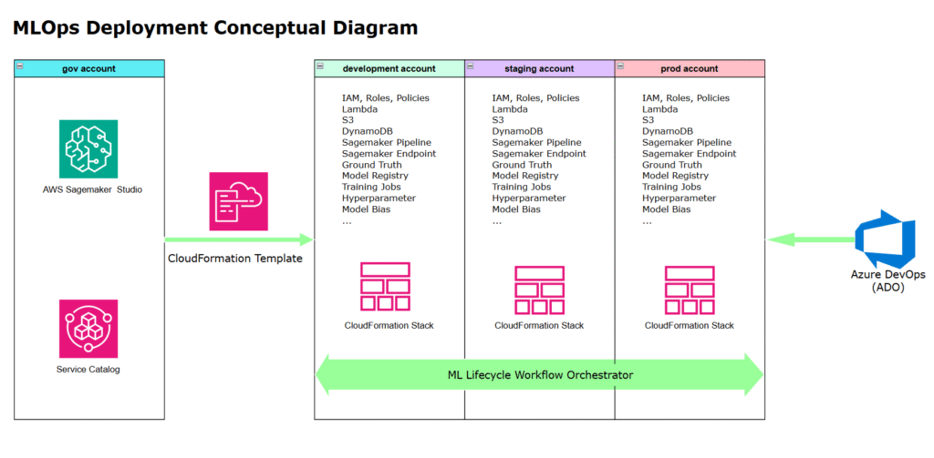 The AWS Sagemaker AI framework uses CodePipeline as the workflow orchestrator. It manages tasks such as building, deploying, testing, preparing data, training models, running inferences, and evaluating results. We define this pipeline using Python CDK in a CloudFormation template, and it operates within the same AWS account.