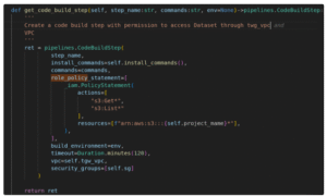 Following is the code snippet to define a step in AWS CodePipeline with specific permission, VPC, and Subnet: