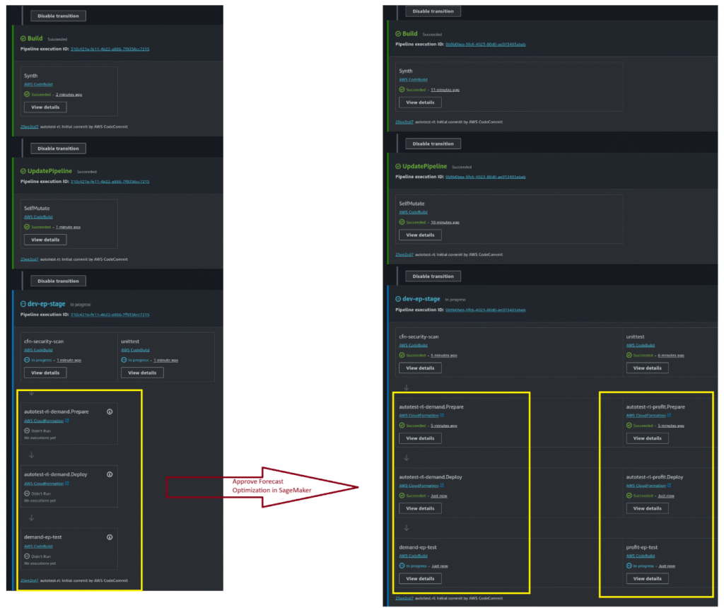 Approve Demand Optimization Model – Data scientists approve the demand optimization model in SageMaker Studio. Pipeline detects approval, auto-adjusts to a single-branch pipeline, and performs inference (left diagram).
