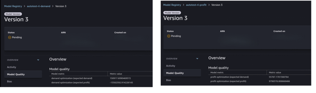 In the Model Registry, Total Reward is used as the primary model quality metric. The examples below illustrate results for the two optimization objectives: